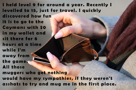 "I held level 9 for around a year. Recently I levelled to 15, just for travel. I quickly discovered how fun it is to go to the Caymans with $0 in my wallet and sit there for 8 hours at a time while I'm away from the game. All those muggers who get nothing would have my sympathies, if they weren't asshats to try and mug me in the first place."