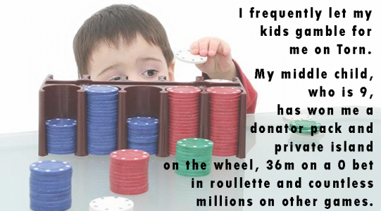 "I frequently let my kids gamble for me on Torn. My middle child, who is 9, has won me a donator pack and private island on the wheel, 36m on a 0 bet in roulette and countless millions on other games."