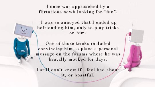 "I once was approached by a flirtatious newb looking for “fun”. I was so annoyed that I ended up befriending him, only to play tricks on him. One of those tricks included convincing him to place a personal message on the forums where he was brutally mocked for days. I still don’t know if I feel bad about it, or boastful."