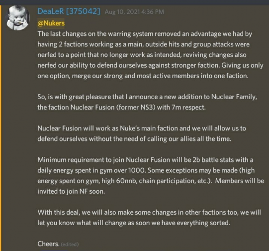 "When all the new mega factions coming out like monarch, requiring billions of battle stats just to join. It's either join them in making our own mega faction or be left behind and defenseless against them." - Anon Nuke member