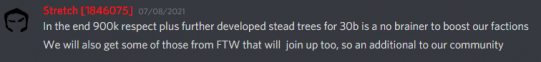 "We were very upfront with our intentions for the faction and our process, because they deserved that. We tried to offer a spot to as many FTW members as we could across NS1-4. Overall, about 30+ FTW members are now in NS factions and thus all on the same Discord server, which provides some friendly faces and continuity for them during this transition."