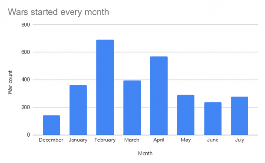 December was incredibly calm, likely due to Christmas town, but activity picked up in January, which saw a huge rise in warring. February, the month of the medical revamp, saw most wars in the last 7 months. After this, the number of wars seems to fluctuate, rather than fall into a consistent pattern. May and June are usually low on wars - nothing has changed here - and the same goes for July.