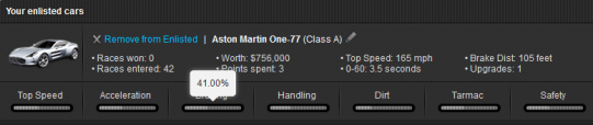 Racers can now view the progress percentages for each car statistic through the use of a tooltip. Whereas previously the car stats page displayed each vehicle's Top Speed, Acceleration, Braking, Handling, Dirt, Tarmac, and Safety through the use of a progress bar, hovering over this bar will now give you a specific percentage value too.
