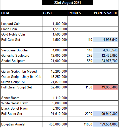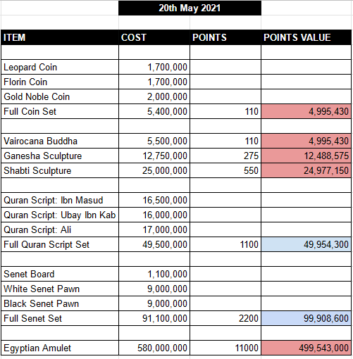 Here's a snapshot of the financial cost of certain items versus their payouts taken from May 20th, 2021. At the time, the value of points was $45,413, having crashed soon after Museum Day ended.