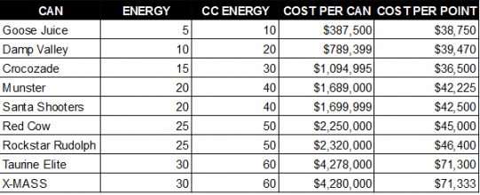 Crocozade now offers the best value per point, with X-MASS technically the worst at $71,333. Of course, cooldown will have to be taken into account when choosing your Energy Drinks, and that means that the 30 energy cans will be the drink of choice for those who are lucky enough to own them.