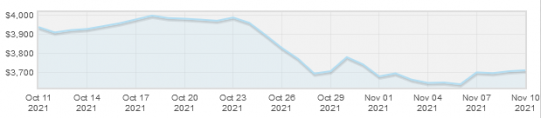 Both types of First Aid Kit enjoyed a price rise in October thanks to the combined effect of the increase in warring and the Trick or Treat event. SFAKs rose from $5k to a high of nearly $7k, but they have now fallen down to $4.8k. FAKs rose from $7.6k to $12.5k, but they have kept more of this inflated value, and are currently priced at close to $9k each.