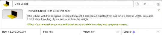 The headline item up for sale is a Gold Laptop valued at $8 billion TCT. There are only nine of these in existence, making Gold Laptops one of the rarest items in Torn City, so we expect competition to be fierce when it goes up for sale this week. Due to its scarcity, you'll be able to find the Gold Laptop under the Extremely Rare category down at the auction house.