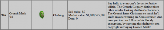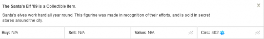Next up is a Santa's Elf '09, another collectible from ye olde days of Torne past. There are 402 of these in existence at the time of writing, and that makes Santa's Elf '09 a Very Rare item. You can find these up for sale for about $500 million on the item market at the moment, so we expect this one to go for just under that at roughly $450 million.