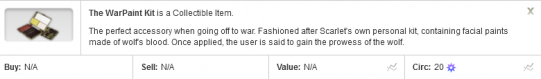 Duke's final item is a WarPaint Kit, an old collectible piece of which there are just 20 in circulation, making it yet another Extremely Rare object. The item's description suggests that these face paints are made from wolf blood, but tests have revealed they also contain dangerously high levels of Myrrchcury.