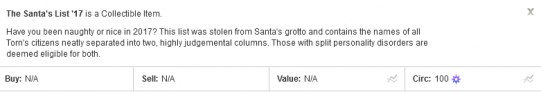 Leslie is also getting in on the action this year with three auctions of his very own. You'll be glad to know that his items aren't themed around the story of the nativity, but two of them do have a Christmas theme. The first item Leslie will sell is the Santa's List '07. This item was one of just 100 given away during Duke's 2017 Christmas Giveaway, thus making it yet another Extremely Rare item. Santa's Lists are currently valued between $900 million to $1.1 billion on the item market.