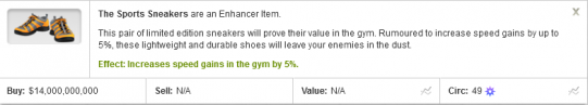 The final item provided by Leslie is a pair of Sports Sneakers. This could be the main event of this year's auction as Sports Sneakers are the only useful item being offered up for sale by our NPCs - they increase your speed gains in the gym by 5%. Sports Sneakers are valued at $14 billion and have a circulation of just 49 as of December 2021, and you will find these under the Extremely Rare tab in the auction house.