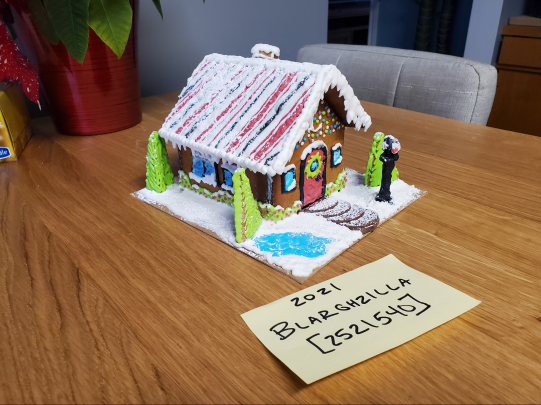 Our final community event was the Christmas Baking contest, an event which is often so riddled with photos of disgusting mess it puts bling_bling's secret hard drive to shame. Third place went to Blarghzilla for their bright and colourful gingerbread house. Great minds have often pondered the puzzling situation of a gingerbread man sitting in a gingerbread house. Is the house made of flesh, or the man made of house? Blarghzilla's entry did nothing to answer this question, but it was neat and pretty.