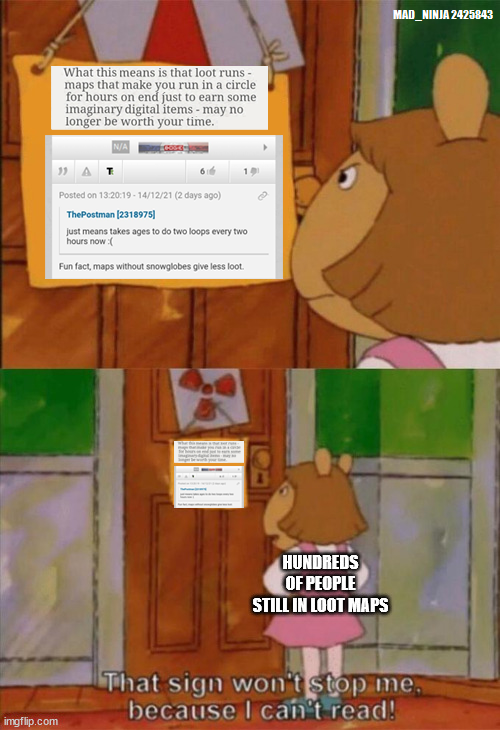 The winning meme was created by Mad_Ninja, whose use of the DW template referenced the bizarre choice made by many players to continue playing loot runs during this year's Christmas Town, despite the fact that wenerfed the f**k out of them boosted the good maps.