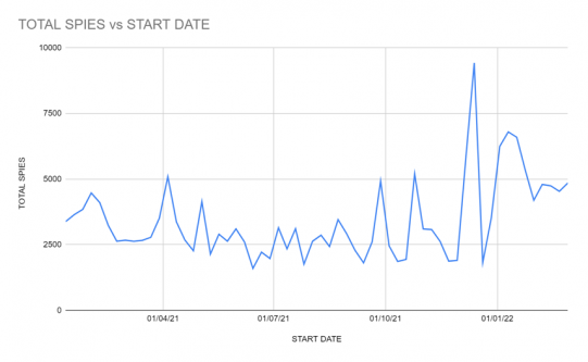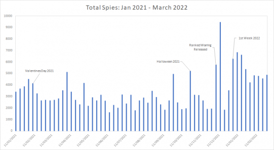 While the number of spies does drop considerably over Christmas - a time when most factions ease up off war modes - the arrival of January sees spy demand return to the levels we saw during Halloween. This is also the first period where we are able to compare the number of spies committed in 2022 against those committed in the same time period for 2021, and while the data set is quite small, it does give us an indication of where things are heading.