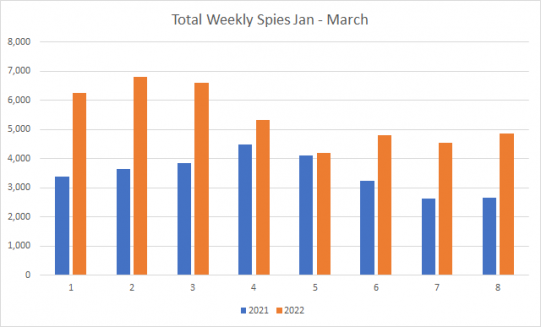 In the first eight weeks of the year, demand for spies has risen by almost 55% compared to 2021. The average number of spies performed per week was 2,898 during 2021. This year, the average is 5,345.