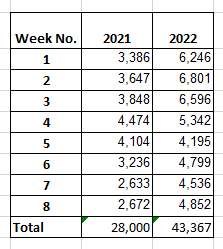 Week 1 is actually Week beginning January 11th, as due to the nature of the data sets provided it is hard to match up the numbers perfectly. What we have here are the first 8 weeks of the year beginning January 11th, 2021, and I've matched up as best I can the numbers from the same period in 2022. In terms of dates, it's off by 1 day. Here's a weekly comparison of the raw numbers.