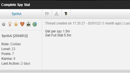 For the past decade, it's been hard for players to sell spies above the typical asking price, and the reasons for this are twofold. First, unlike other skills such as Hunting, Racing, and Reviving, the art of the spy does not rely on a personal stat score. This means that every player has the same chance of getting a full set of stat results, hence the lack of variation in spy prices.