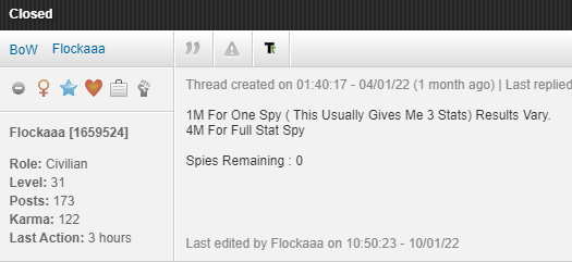 The price then stabilised at around 4 Xanax per full report, but this is still four times the old price. Remember my earlier example of how much I would have been paid under the old pricing? At 4 Xanax per report, that equates to 2.45 Xanax per full spy, compared to 0.61 before. And yet despite this huge price leap, it seems that everyone found buyers, judging by how quickly the sellers closed their threads.