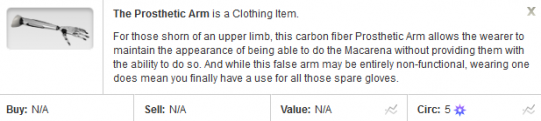 The newly-released Injury Cache has become Torn's most sought-after cosmetic cache, with prices of around $130 million demanded for these medical-themed clothing drops. When we checked the market on the 6th there were 12 Injury Caches for sale out of 280 in circulation. The highest valued items within said cache is currently the Prosthetic Arm, with just one up for sale at a whopping $4 billion.