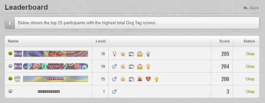 A top 25 leaderboard will now be displayed throughout the Dog Tag Tournament on the competition page. This leaderboard, much like the Easy Pickings and Your Superiors panels, will be updated on an hourly basis.