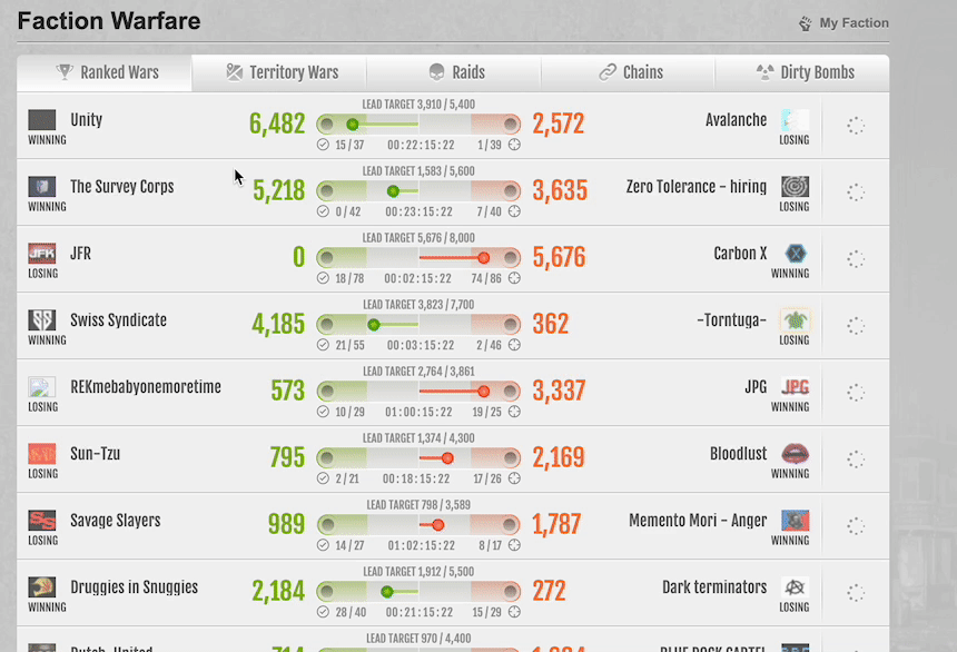The Faction Warfare page is your one-stop shop for all the latest and historical information regarding organised violence in Torn City. This hub, which can be accessed by clicking the top right link on the Faction or My Faction page, contains individual sections pertaining to Ranked Wars, Territory Wars, Raids, and Chains that have happened or are currently happening in Torn.
