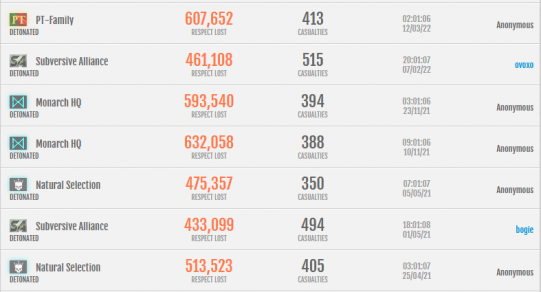We've also included a formal record for every Dirty Bomb that has been detonated in Torn City going back to 2019. If the bomber has gone public, their name will be available to view in the far right column, otherwise, the bomber's identity will remain anonymous.
