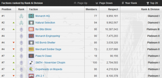 The first category, Faction Rank, orders factions by their Ranked Warfare Rank and Division. As you can see, Monarch HQ and Natural Selection are the only two factions to have made it to the highest rank of Diamond thus far, with the former earning the honor of being the first to achieve this after beating Natural Selection II in early June.