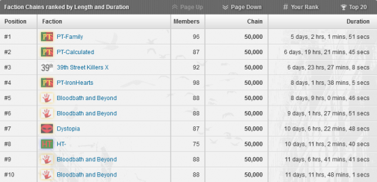 The second new faction category displays all Faction Chains in order according to their size and duration. PT's dominance of this category is plain for all to see, as not only do they hold the 1st, 2nd, and 4th fastest 50,000 chains in history, they also have two further entries on the first page by virtue of their fastest 25,000 chains too.