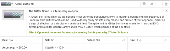 Glitter Bombs are a harmless temporary item created as part of Torn City's recognition of Pride month. Contrary to what some would have you believe, Pride month was not created to turn your son into a femboy and force your daughter to listen to Alice Phoebe Lou. Pride exists to celebrate the history and struggles of the LGBTQ+ community while also serving to raise awareness of the issues they face today.
