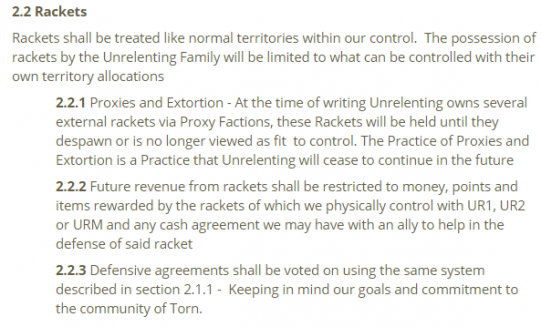 The second reason for Subversive Alliance pulling out is that Relentless has pulled out. That may seem like an odd thing to suggest given that R's departure gives SA more territories to extort. However, we have been told by several reliable sources of a secret agreement which existed between R, SA, and to a lesser extent 39th Street, to control the racket industry through a combination of extortion and fear.