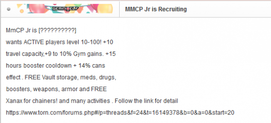 Further to our earlier reports that MMCP is going it alone in an attempt to become a major force in Torn City, we can reveal that the Myanmar-based outfit is currently on a recruitment drive.