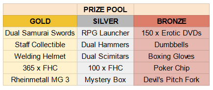 The first-place players in each of our three community events may pick a prize from the Gold Pool, with second and third-placed players able to choose from the Silver and Bronze pools. The order of priority for each competition will be randomised when the winners have been chosen. These prizes are paid out in addition to the usual prizes and ribbons associated with Community Events, which are as follows: